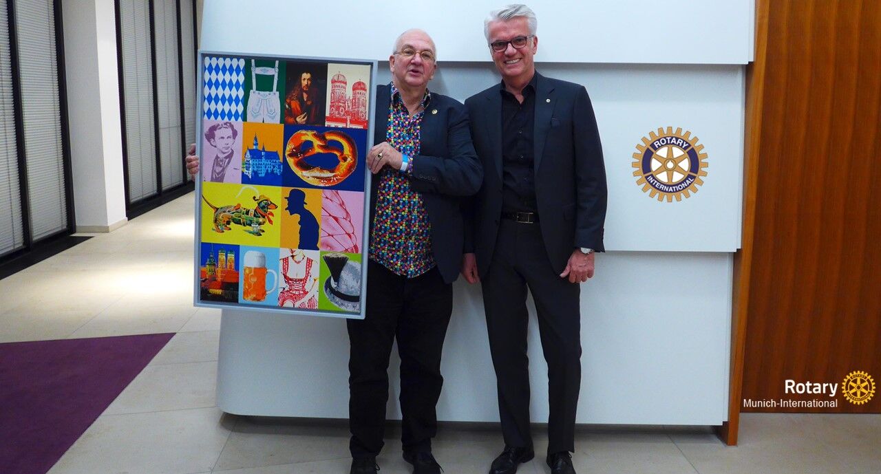 Wir freuen uns über farbenfrohe bayerische Originale in unserem Büro – und die Förderung eines guten Zwecks: Bei der jährlichen Benefiz-Kunstauktion des Rotary Clubs München International ersteigerte unser Geschäftsführer Dr. Hans-Josef Mayer (rechts im Bild) das Werk „Bayern goes Pop“ von Christian Rothmann (links im Bild).
